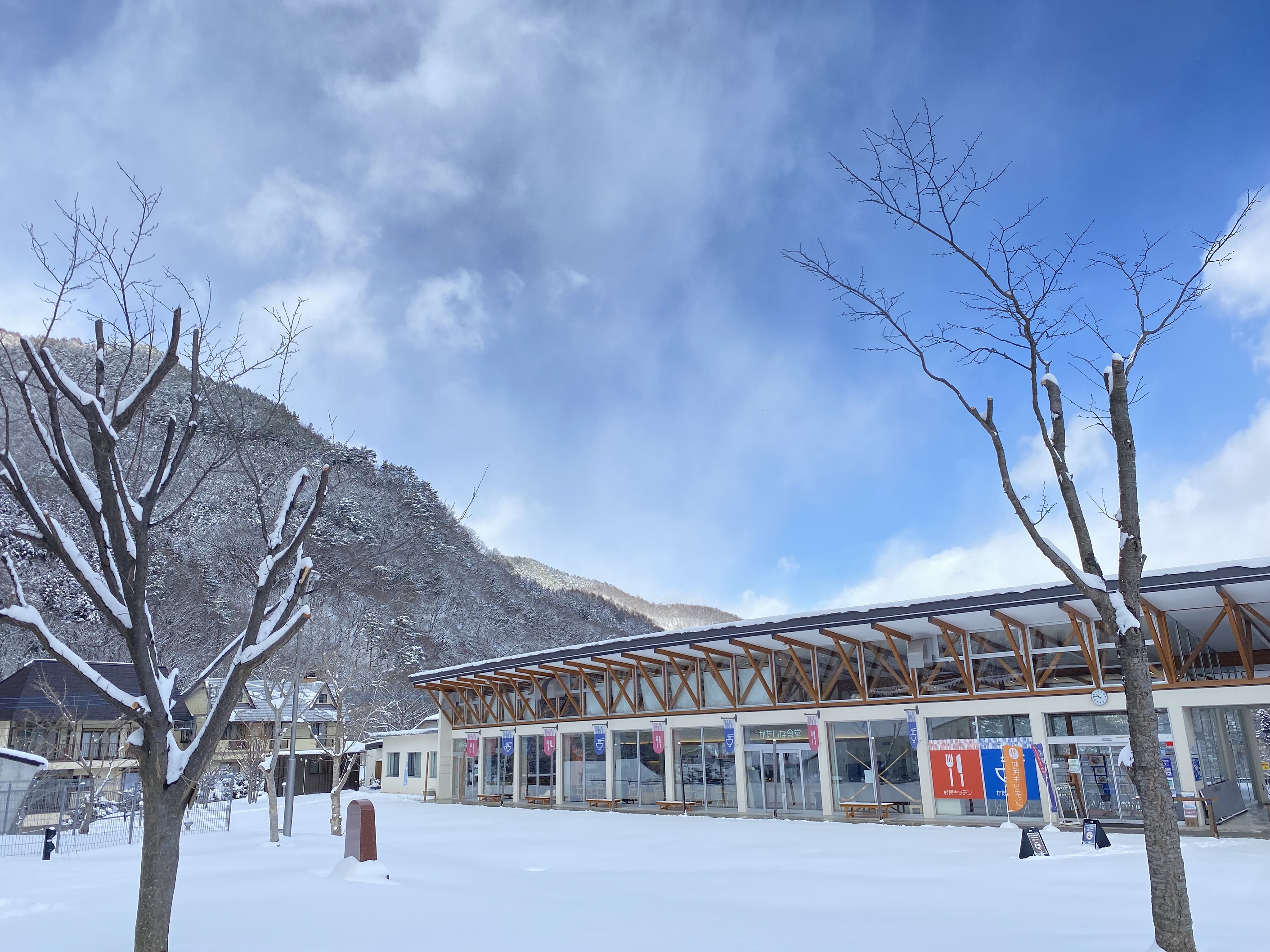 村の玄関口として観光客に人気。冬の休憩や買い物に便利で、名水を使ったコーヒーやお土産が楽しめます。