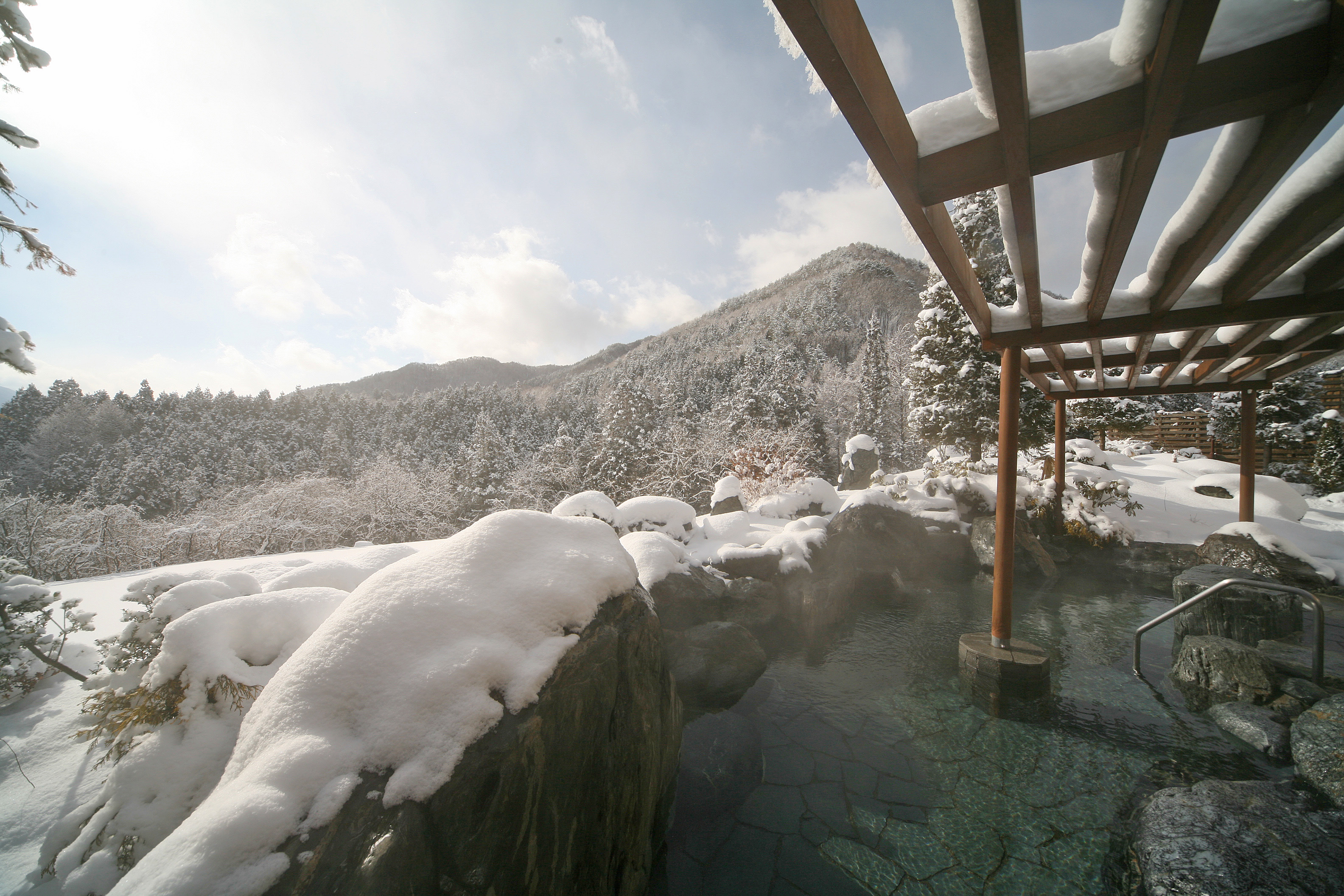 雪景色と温泉が楽しめる人気の癒しスポット。冬の露天風呂と館内のレストランで、ゆっくり温まれる施設です。