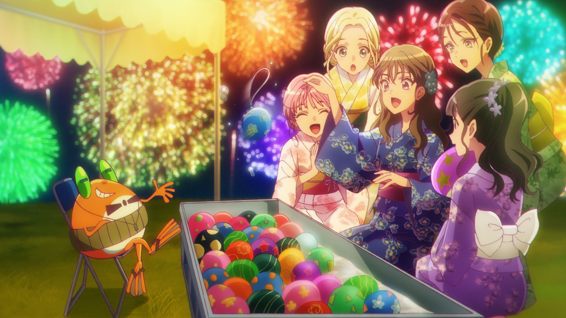 約1時間にわたり花火が打ち上げられる夏の風物詩。9話では現地に行けなかったが、ウィッチバースでお祭り気分。